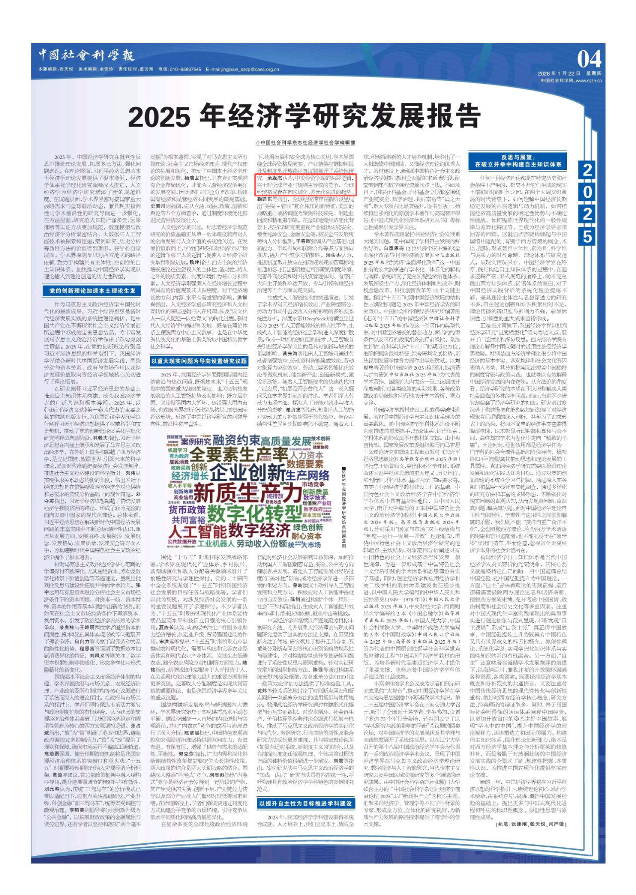 2025年,我国经济学界紧跟国际国内经济前沿与热点问题,既聚焦未来“十五五”规划中的国家重大战略的制定,也关切科技发展前沿的人工智能趋势及其影响;既立足中国,关注做强国内大循环、建设强大国内市场,也放眼世界剖析全球贸易格局、展望国际经济形势,延续了中国经济学研究的问题导向性、前沿性和丰富性。