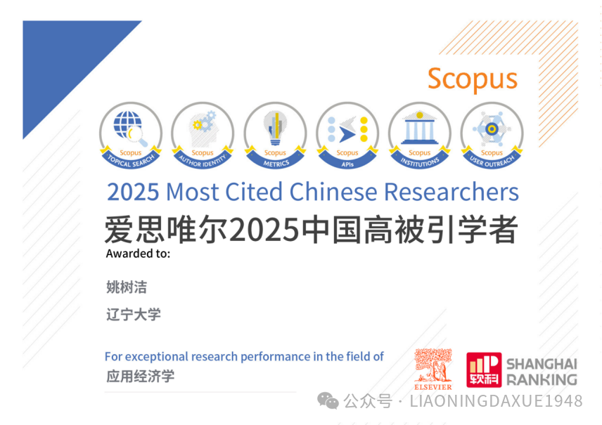 1月30日,爱思唯尔 (Elsevier) 发布2025“中国高被引学者” (Highly Cited Chinese Researchers) 榜单。上榜的学者来自543所高校、企业及科研机构,覆盖了教育部10个学科领域、83个一级学科。辽宁大学党委副书记、校长余淼杰教授,辽宁大学副校长陆安慧教授,李安民经济研究院院长姚树洁教授成功入选。